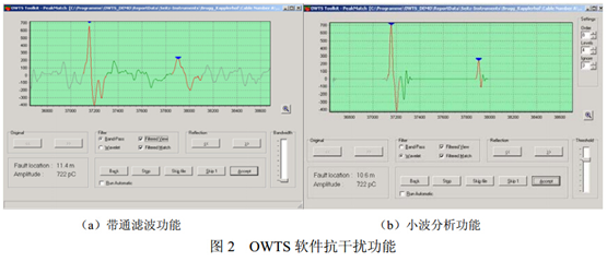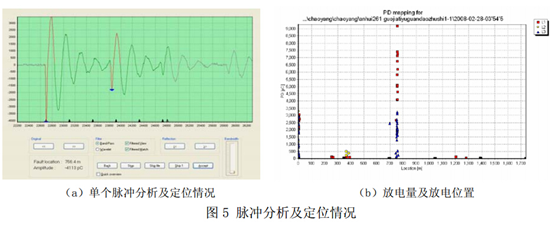 (2)對于脈沖型干擾,由于它和局部放電信號非常相似,從單個波形上很難將它們區分開來。目前主要采取時延鑒別法進行鑒別。時延鑒別法是利用外來干擾脈沖及發射波到達測量點的時間差與內部放電及反射波到達測量點的時間差的不同進行鑒別。