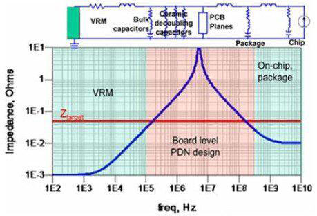 在調試該故障前先回顧下電源噪聲抑制的原理。如下圖所示,電源分配網(wǎng)絡中不同的頻段由不同的元件來抑制噪聲,去耦元件包含電源調整模塊(VRM)、去耦電容、PCB電源地平面對、器件封裝和芯片。VRM包含電源芯片及外圍的輸出電容,大約作用于DC到低頻段(100K左右),其等效模型是一個電阻和一個電感組成的二元件模型。去耦電容*好使用多個數(shù)量級容值的電容配合使用,充分覆蓋中頻段(數(shù)10K到100M左右)。由于布線電感和封裝電感的存在,即時大量堆砌去耦電容也難以在更高頻起到作用。PCB電源地平面對形成了一個平板電容,也具有去耦作用,大約作用在數(shù)十兆。芯片封裝和芯片負責高頻段(100M以上),目前的高端器件一般會在封裝上增加去耦電容,此時PCB上的去耦范圍可以降低到數(shù)十兆甚至幾兆。因此,在電流負載不變的情況下,我們只要判斷出電壓噪聲出現(xiàn)在哪個頻段,那么針對這個頻段所對應的去耦元件進行優(yōu)化即可。在兩個去耦元件的相鄰頻段時兩個去耦元件會配合作用,所以在分析去耦元件臨界點時相鄰頻段的去耦元件也要同時納入考慮。