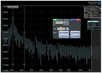 電源噪聲測量時不要求較高的采樣率,所以可以設置很長的時基,這也意味著采集的信號時間可以足夠長,可以認為覆蓋到了整個有效信號的時間跨度,此時不需要添加窗函數(shù)。調整以上設置可以得到比較準確的FFT變換曲線了,再通過zoom功能查看感興趣的頻點。如下圖中電源噪聲的主要能量集中在11.3KHz左右,并以該頻率為基波頻率諧振。據(jù)此可以推斷本PDN網(wǎng)絡在11.3KHz處的阻抗不能滿足要求,電容在該頻點的阻抗也比較高,起不到降低阻抗的作用,所以前面增加電容并不能減小電源噪聲。