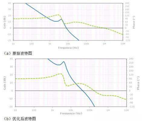 一般來說,11.3KHz應該是VRM的管轄范圍,此處出現(xiàn)較大噪聲說明VRM電路設計不能滿足要求。這里對VRM的性能進行分析,VRM分析的方法眾多,此處主要采用仿真其反饋環(huán)路波特圖的手段。波特圖主要觀察幾個關鍵信息:1、穿越頻率,增益曲線穿越0dB線的頻率點;2、相位裕度,相位曲線在穿越頻率處所對應的相位值;3、增益裕度,相位在-360°時所對應的增益值。這里我們主要關注穿越頻率和相位裕度這兩個指標。從VRM的環(huán)路波特圖(如下圖a)可以看到,VRM的穿越頻率在8KHz左右,相位裕度37度。這里存在兩個問題:首先VRM的相位裕度一般需要大于45度才能保證環(huán)路的穩(wěn)定工作,這里相位裕度稍小一些,需要增加相位裕度;其次穿越頻率太低,穿越頻率附近VRM的調整作用逐漸降低,而此頻點bulk電容還起不到作用,所以在8KHz附近會存在較高的阻抗,這個頻點的噪聲抑制作用較差。下圖(b)是優(yōu)化VRM環(huán)路之后的波特圖,調整相位裕度到50度,穿越頻率推到46KHz左右。