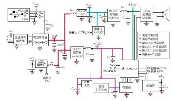 在圖2中,主電源軌已被顏色編碼,流經相應GND符號處的電流已被匹配到提供電流的電源軌。例如,每一個與電池充電不相關的部件(紅色),有一個端電流返回到電池,但USB到音頻IC由3.3V BUCK調節器供電,而它是由5V Boost調節器供電的,之后接到電池。因此,GND電流從音頻IC按先后順序返回到各調節器,然后到達電池,音頻IC電流不會直接返回到電池。