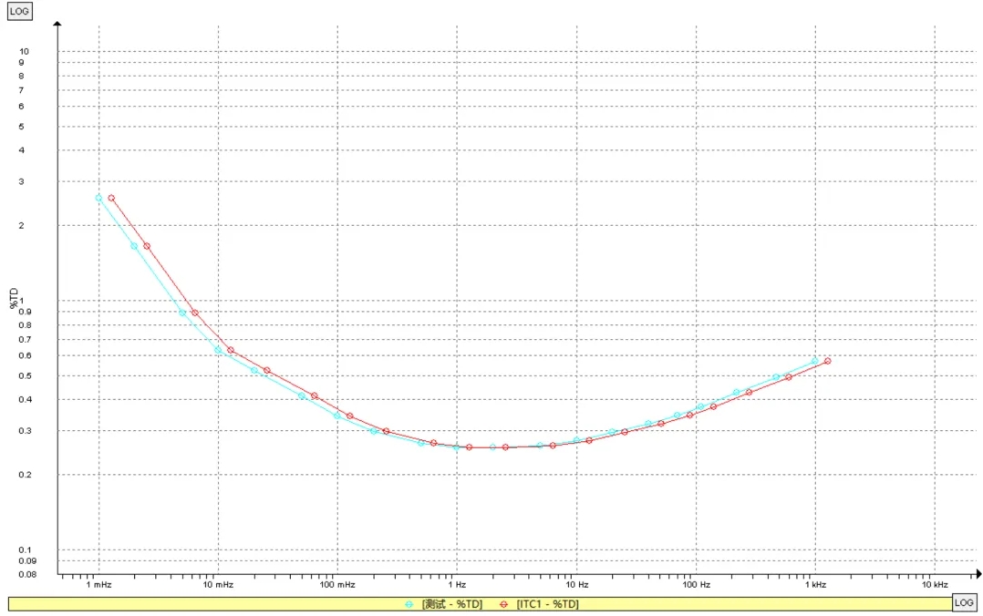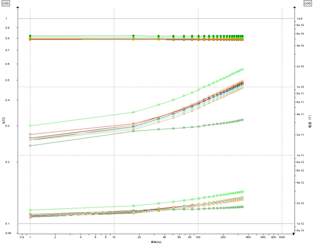 介質(zhì)譜分析測試的是各個不同頻率下的電容值和介損值,并繪制成電容和介損的頻率曲線。介質(zhì)譜曲線能夠更為清晰地反映絕緣的狀態(tài),并且有助于判斷測試結果是否存在異常。介損隨頻率改變,從左到右頻率逐次增大。可以看到,測試結果曲線與模型曲線十分平滑且基本一致。模型曲線與測試曲線有偏移的原因是溫度不同。